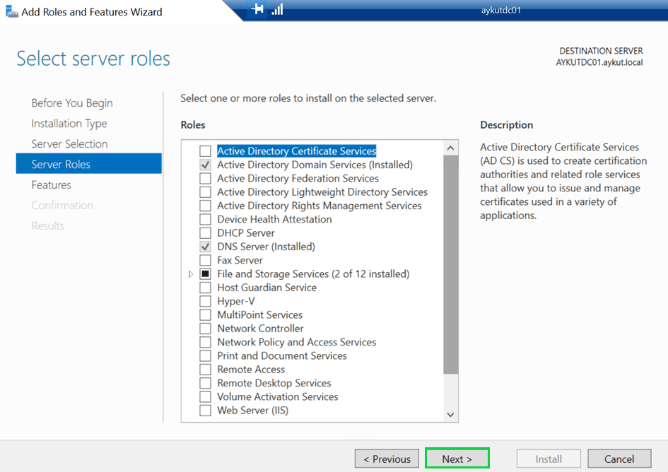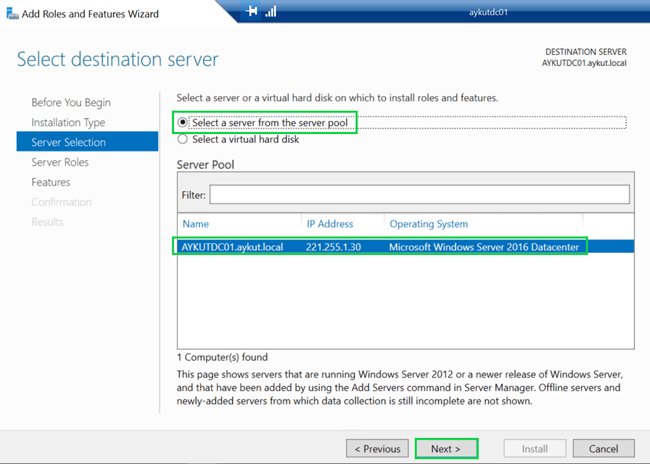 “Server Selection” alanında rolün hangi sunucuya kurulacağı bilgisini seçiyoruz ve devam ediyoruz.