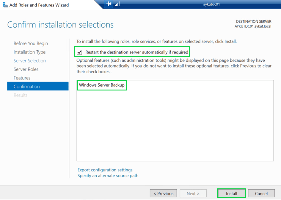 Gelen ekranda Windows Server Backup özelliğini kuracağını belirtiyor, restart gerekiyorsa restart yapması için “Restart the destination server automatically if required” kutusunu işaretliyoruz. Ancak Windows Server Backup kurulumları restart gerektirmemektedir. Install seçeneği ile kurulumu başlatıyoruz.