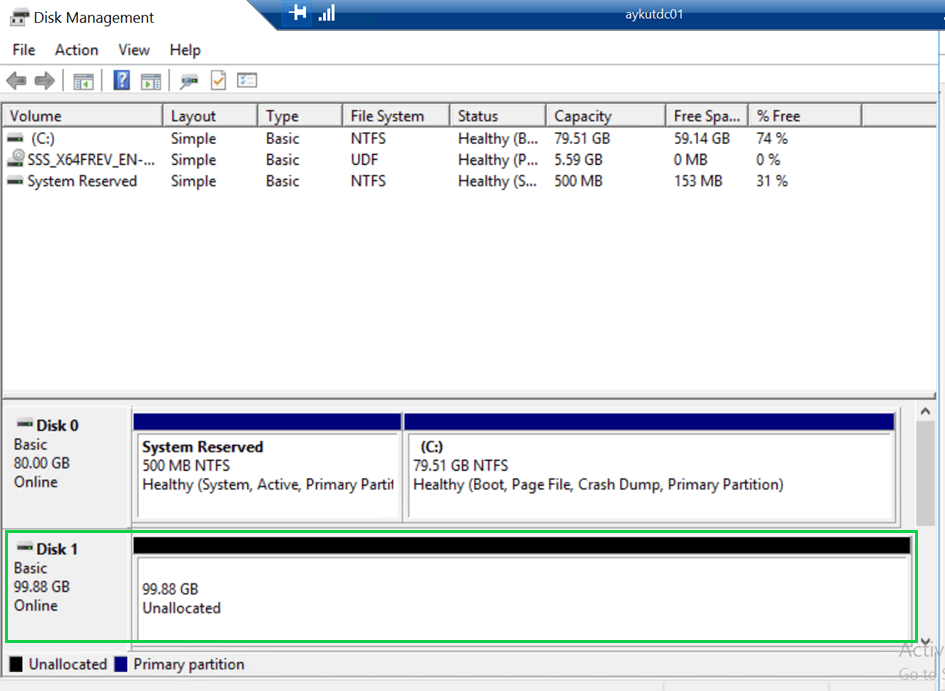 Sunucumuza 100 GB’lık bir alan ekledikten sonra bu alanı aşağıdaki şekilde tanımlıyoruz. Bu diski bu şekilde bırakıyoruz, backup alma sırasında detaylı açıklaması yapılacaktır.