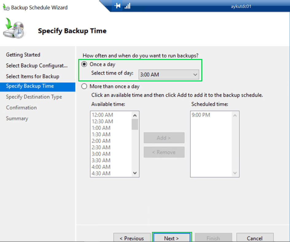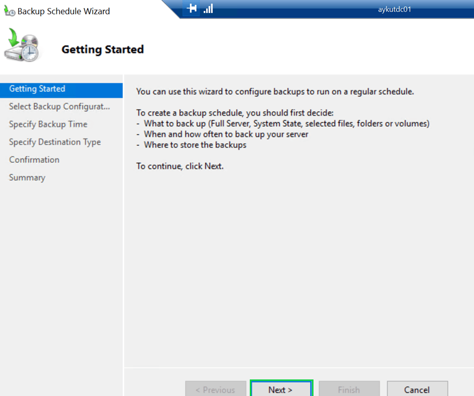 Windows Server Backup ekranı üzerinden “Backup Once” seçeneğine tıklayarak, yapılandırmış olduğumuz scheduled backup ayarlarına göre backup alabiliriz. Backup başlatmak için “Scheduled backup options” seçeneğini seçerek devam ediyoruz.