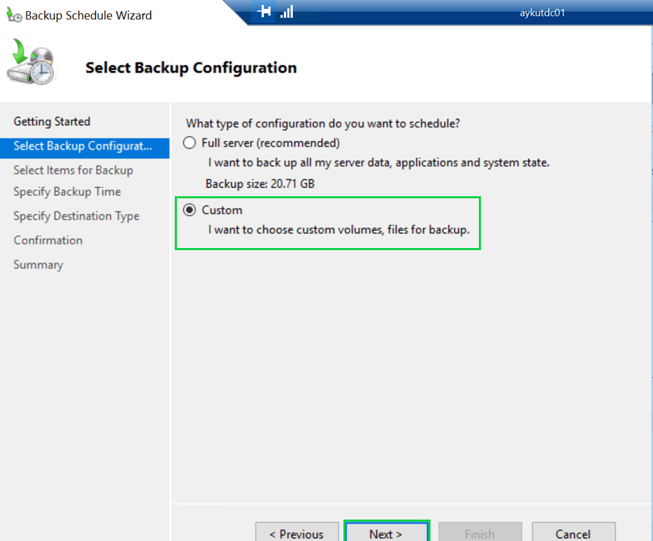 Gelen ekranda bize backup alacağımız sunucunun full backup’ını alıp almayacağımızı sormaktadır. Sunucunun full backup’ını alacaksak, “Full Server (recommended)” seçerek, sadece bizim istediğimiz alanların backup’ının alınmasını istiyorsak “Custom” seçeneğini seçerek devam edeceğiz.