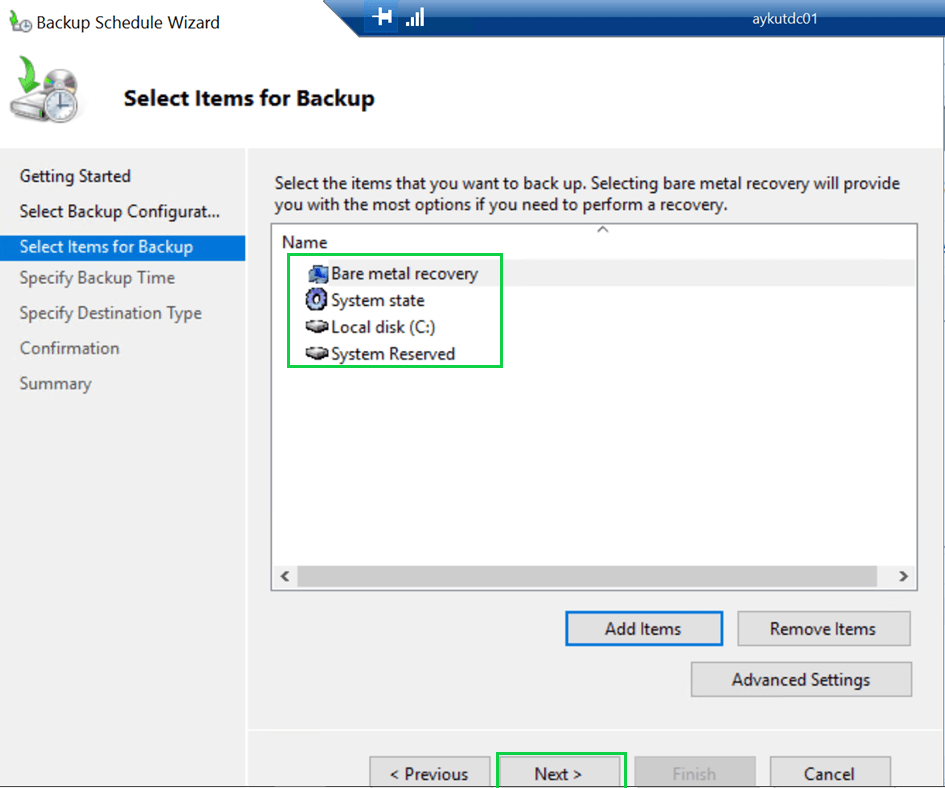 Custom üzerinden ilerlediğimizde nelerin backup’ını aldırmak istiyorsak, “Add Items” üzerinden seçmemiz gerekmektedir.
