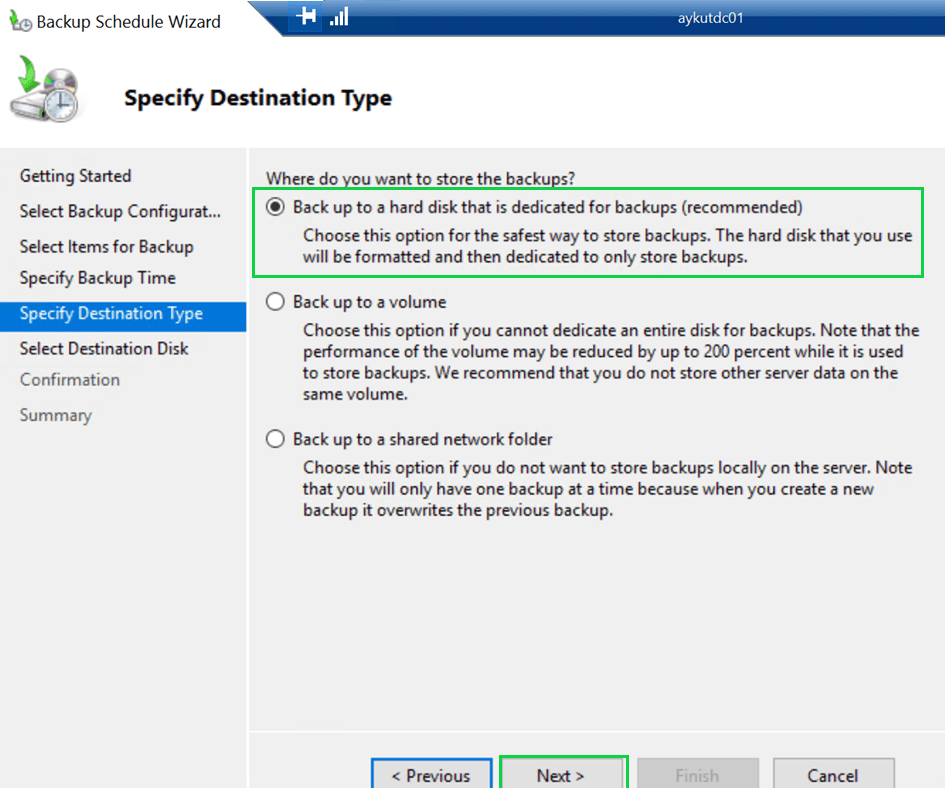 Back up to a hard disk that is dedicated for backups (recommended) : Microsoft tarafından bizlere tavsiye edilen seçenektir. Backup’ların sadece backup için dedicated edilmiş, diskler üzerine alınması ve saklanması isteniyorsa, bu seçenek seçilmelidir.