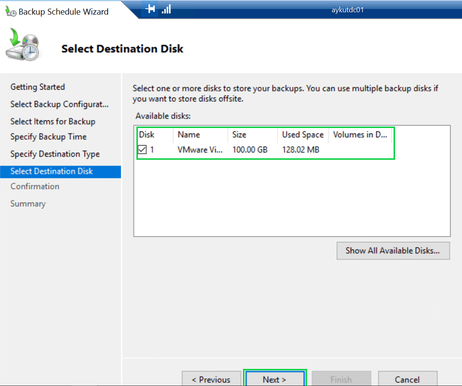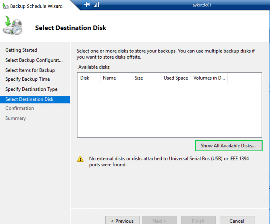 Bu alanda backup için ayırmış olduğumuz diski bizden göstermemizi istiyor, “Show All Available Disk” diyerek devam ediyoruz.