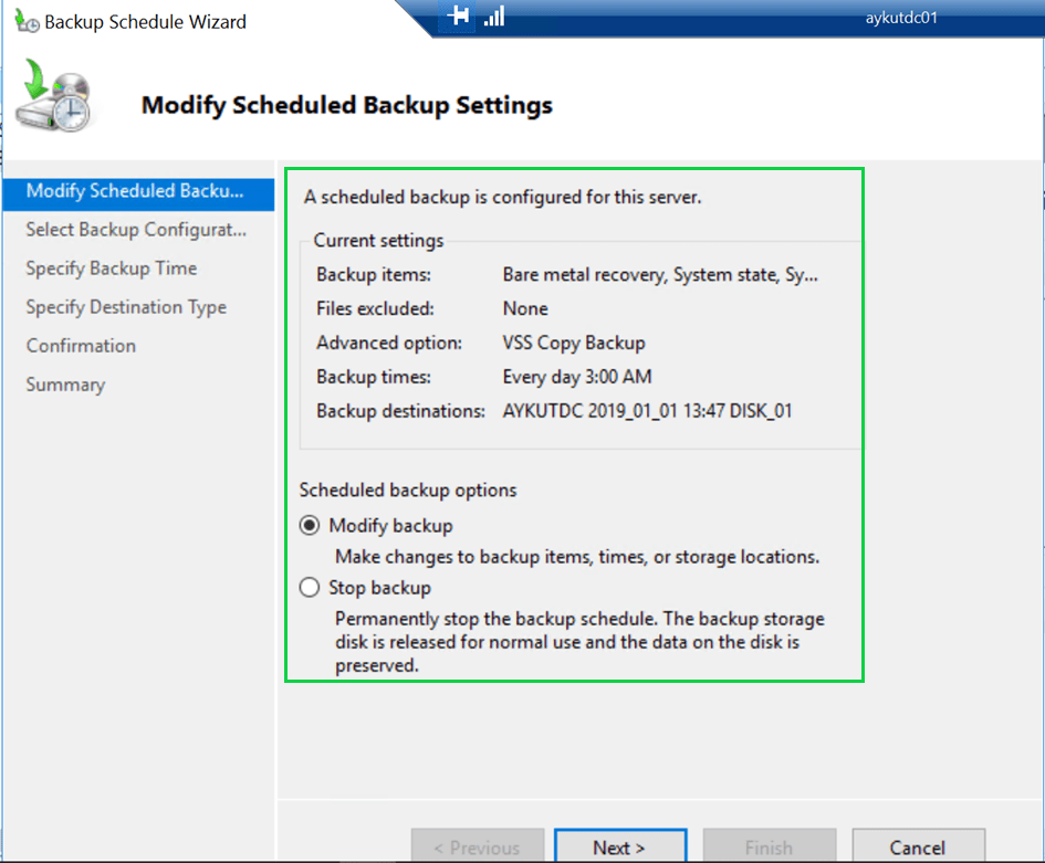 Windows Server Backup üzerinden tekrar “Backup Schedule” alanına gelerek, burada mevcut backup ayarlarımızı değiştirebilir, yada backup alımını durdurabiliriz.