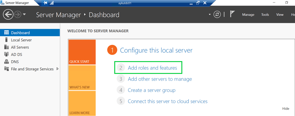 Active Directory sunucusu üzerinden “Server Manager” açılır ve “Add roles and features” tıklanır.
