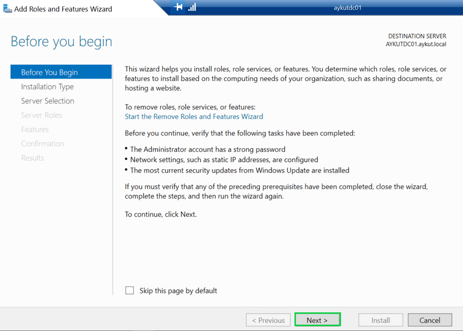 Server Roles alanında herhangi bir rol seçmeden devam ediyoruz.