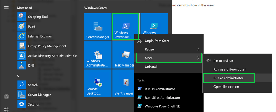Powershell’i başlatmak için Start/Windows Server altından PowerShell’i seçerek yada Start/Windows PowerShell altından, Windows PowerShell’i seçerek başlatabiliriz. Başlatırken yönetici olarak çalıştırmak yapacağımız işlemlerde bize yetki sorunu çıkarmayacaktır. Burada birde Windows PowerShell ISE bulunmaktadır, burayı ise daha uzun komutlar sciptler yazacağımız zaman, Powershell’e nazaran bu tür işlemlere daha elverişli bir arayüzü olan bu ekran üzerinden gerçekleştirebiliriz.