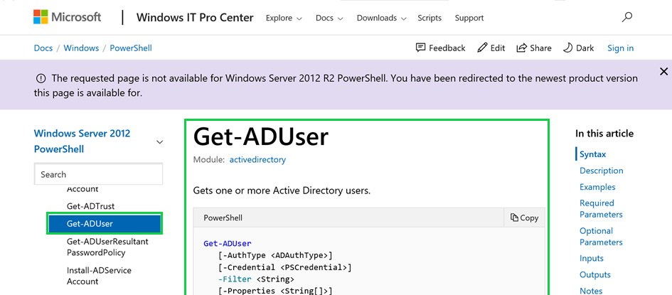 Get-Help Get-AD yazdığımızda “Tab” tuşuna basarsak, bizim karşımıza Active Directory ile ilgili bir çok komut çıkacaktır. Biz bu komutların ne işe yaradığını ve nasıl kullanmamız gerektiğini öğrenmek için yazdığımız komutun sonuna “-online” ifadesini ekleyerek, otomatik olarak açılacak olan web browser üzerinden Microsoft’un ilgili sayfalarına ulaşabiliriz. Örneklerle beraber bilgi alıp, bunları kendi ortamımızda uygulayabiliriz. Ayrıca Microsoft dışındaki birçok Bilgi Teknolojileri kaynaklı sitelerde de Türkçe daha ayrıntılı ve açıklamalı örneklerde bulunmaktadır.