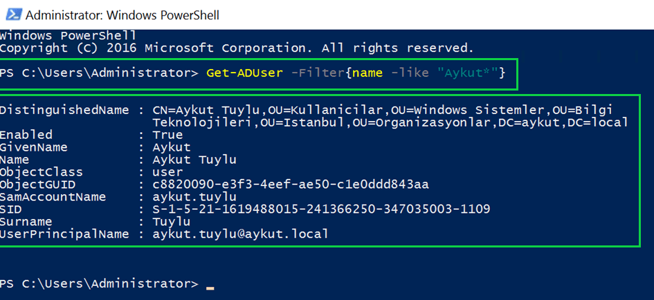 Get-ADUser –Filter{name –like “Aykut*”}