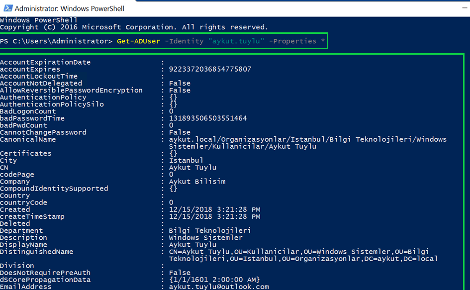Get-ADUser –Identity “aykut.tuylu” –Properties *