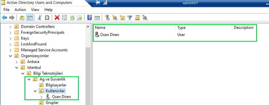 Komutlarımızı yazıp, çalıştırdığımızda herhangi bir hata ile karşılaşmadık. Active Directory Users and Computers ekranına giriş yaparak, kontrol ediyoruz. Kontrol ettiğimizde ilgili OU altında başarılı bir şekilde kullanıcının oluşturulduğunu görmüş olduk.