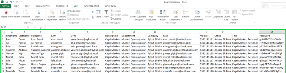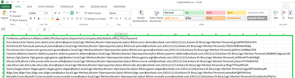 Tüm bilgiler girildikten sonra excel dosyasını “csv” formatında kayıt ediyoruz. Bu şekilde kayıt ettiğimizde excel aşağıdaki formatı alacak olup, bizim Active Directory üzerinde dosyayı gösterebilmemizi ve okutabilmemizi sağlayacaktır.