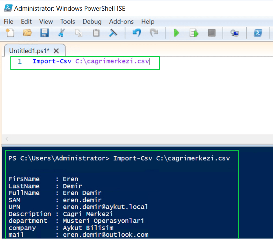 Oluşturmuş olduğumuz csv dosyasını Active Directory sunucusunda C sürücüsü içerisine kopyalıyoruz. Bu işlemden sonra PowerShell ISE açıyor ve oluşturmuş olduğumuz csv dosyasını kopyaladığımız path üzerinden Import-Csv C:\cagrimerkezi.csv komutu ile içeriye aktarıyoruz.