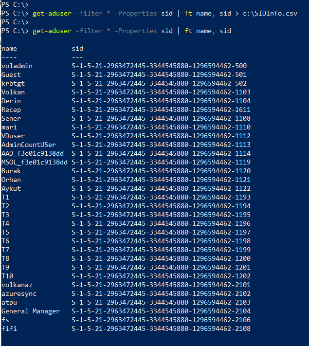 get-aduser -filter * -Properties sid | ft name, sid > c:\SIDInfo.csv