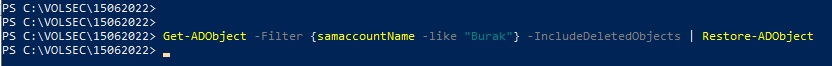 Get-ADObject -Filter {samaccountName -like “Burak”} -IncludeDeletedObjects | Restore-ADObject