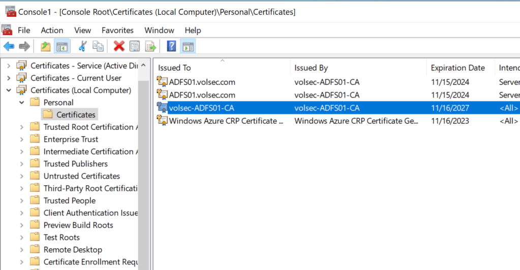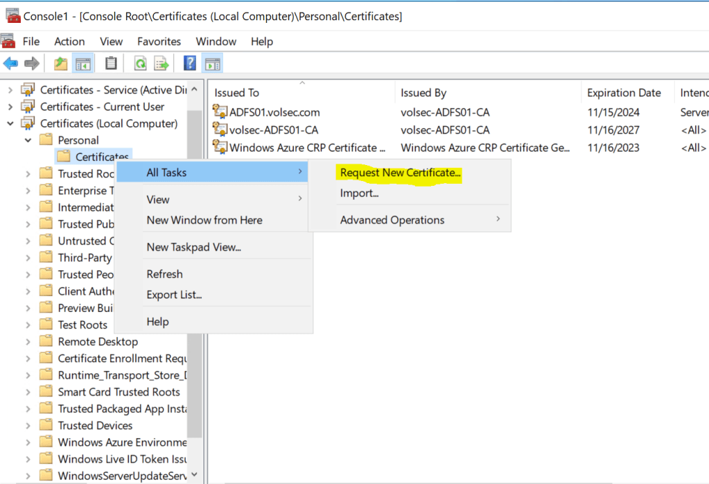 ADFS sunucusunda MMC açılır, Certificate, personel , request new certificate seçilir,