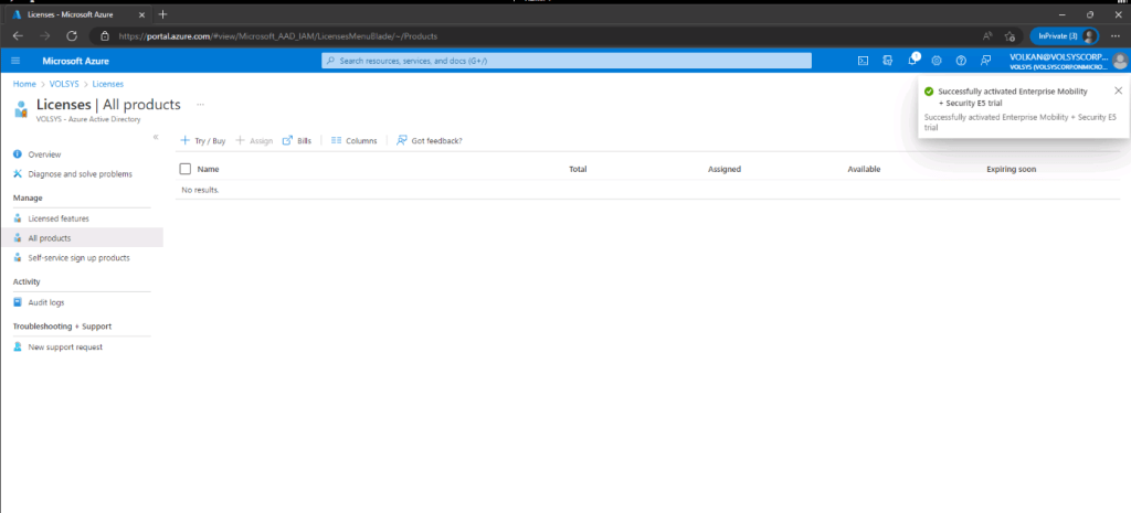 Yükleme tamamlandırktan sonra, All Products’ı güncelliyorum ve Enterprise Mobility + Security E5 lisanısımın geldiğini görüyorum.