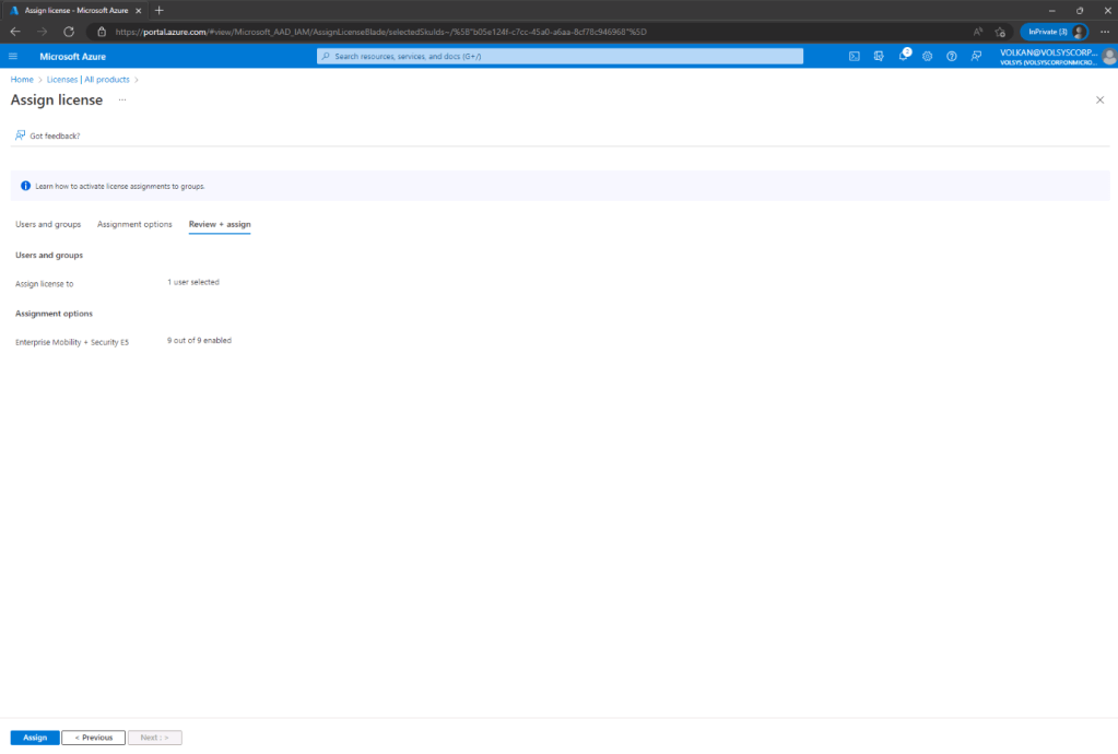 Microsoft Azure’da kullanılacak olan lisansları aktif hale getirmek için, Global Administrator hesabı ile https://portal.azure.com adresine girilir. Oradan Licenses ve All Products seçilir. Ardından orta üst menüde bulunan Try/Buy seçilir ve sağ tarafta gelen menüden, Enterprise Mobility + Security F5, Azure AD Premium P2 gibi lisanslar seçilir Active tuşuna basılarak aktif hale getirilir.