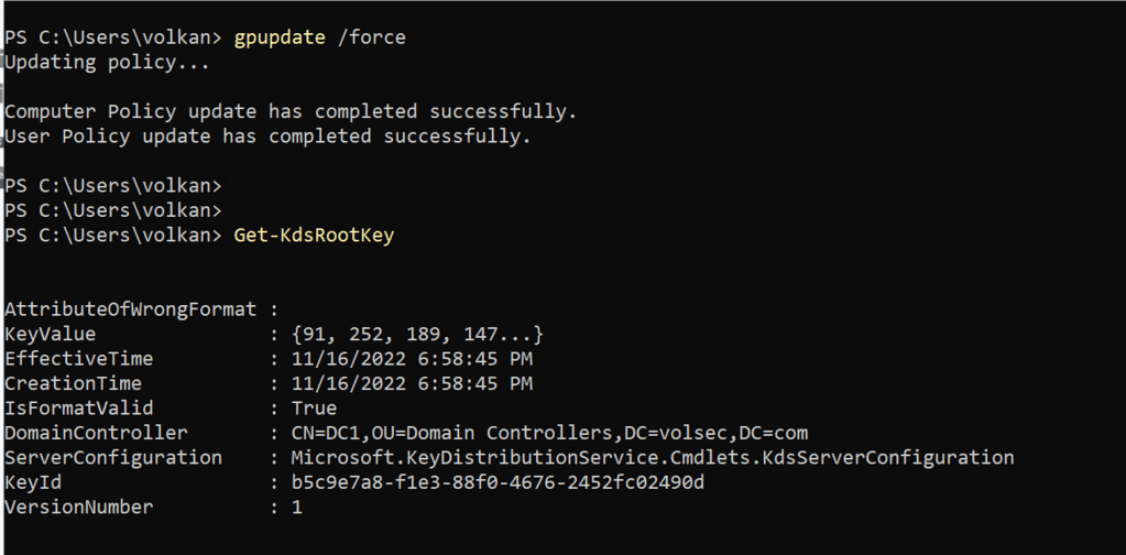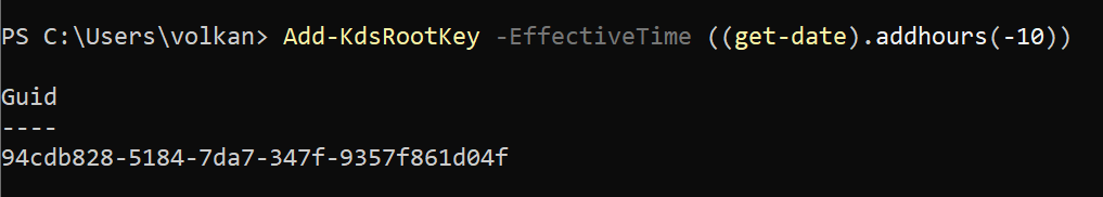 Normal de 10 saat beklenmesi gerekiyor ancak aşağıdaki komut ile KDSRootKey aktif hale gelmektedir.