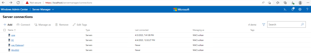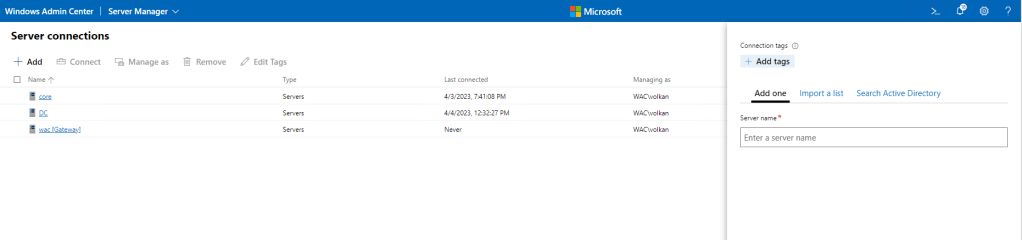 Add one bölümünde Server name’e yönetmek istediğimiz sunucunun adını yazıyoruz. Benim örneğimde Win2022 ve Found Win2022.volsys.com olarak buluyor. Alt kısımda bulunan ADD ile de ekleme işlemimi tamamlıyorum.