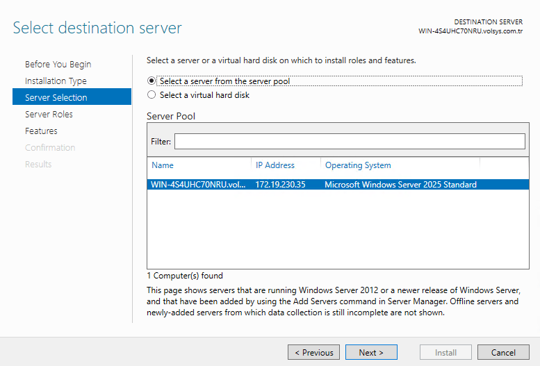 “Server Selection” alanında rolün hangi sunucuya kurulacağı bilgisini seçiyoruz ve devam ediyoruz.