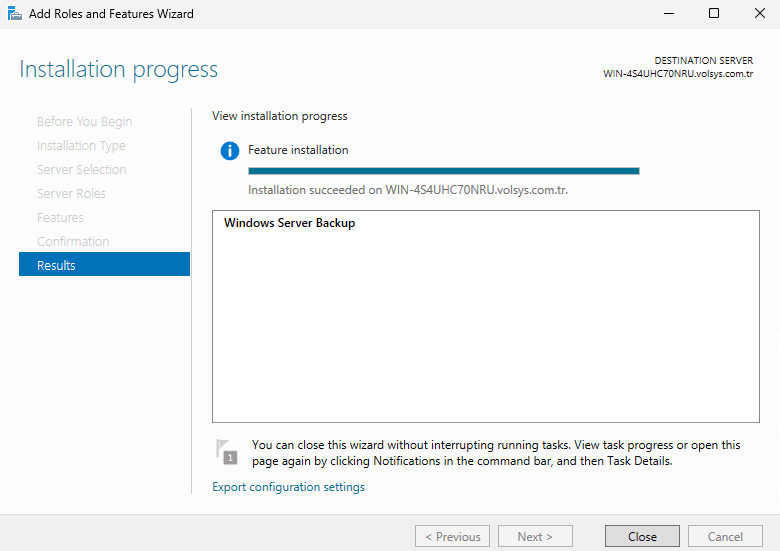 Windows Server Backup özelliği Features alanında yer almaktadır. Windows Server Backup seçerek devam ediyoruz.
