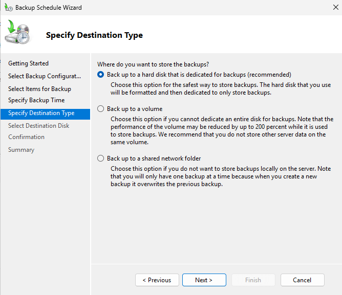 Back up to a hard disk that is dedicated for backups (recommended) : Microsoft tarafından bizlere tavsiye edilen seçenektir. Backup’ların sadece backup için dedicated edilmiş, diskler üzerine alınması ve saklanması isteniyorsa, bu seçenek seçilmelidir.