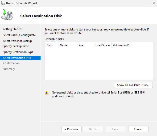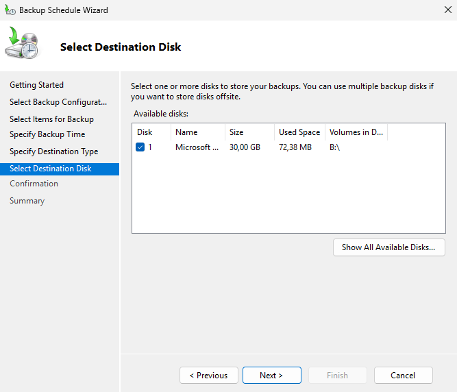 Bu alanda backup için ayırmış olduğumuz diski bizden göstermemizi istiyor, “Show All Available Disk” diyerek devam ediyoruz.