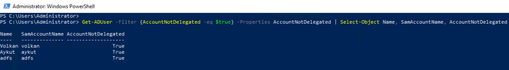 Get-ADUser -Filter {AccountNotDelegated -eq $true} -Properties AccountNotDelegated | Select-Object Name, SamAccountName, AccountNotDelegated
