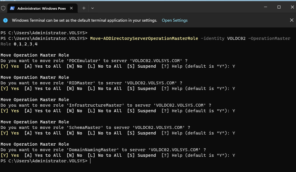 FSMO roller yeni kurulan DC’ye transfer edilir.