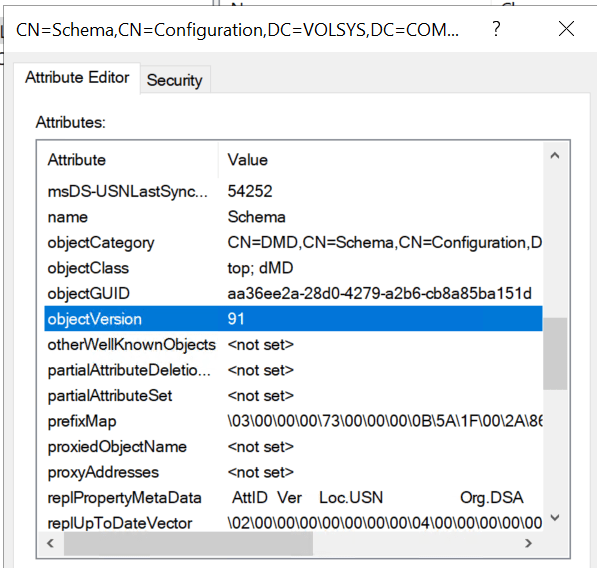 Adsiedit üzerinde schema upgrade edildi kontrol edilirve objectversion ın 91 olduğu görülür.