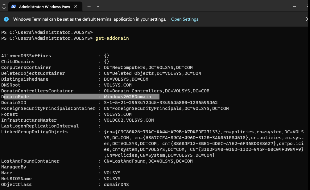 Get-AdDomain komutu ile mevcut DFL versiyonu kontrol edilir.