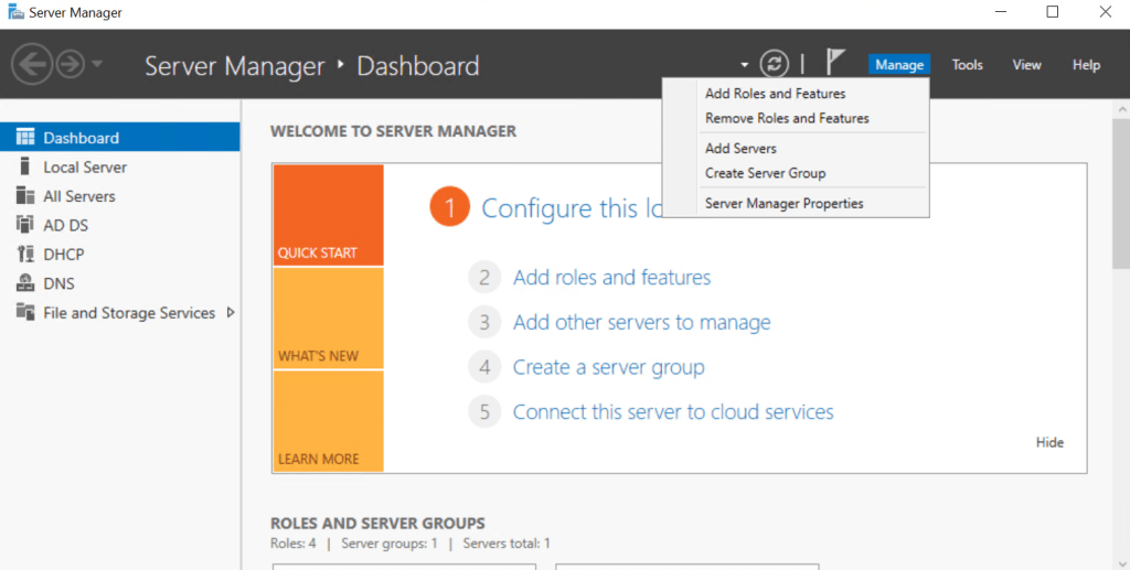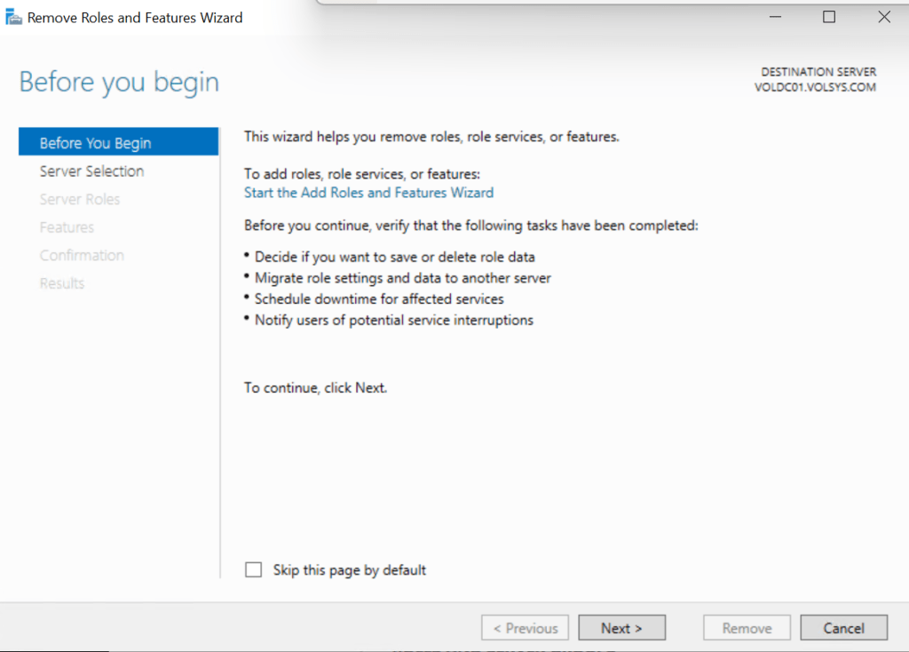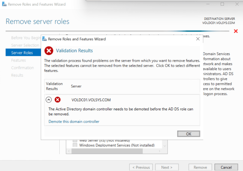 Windows Server 2019/2022 Domain Controller üzerindeki, ADDS rolünü kaldırmak için Server Manager’dan Manage – Remove roles and features seçilir