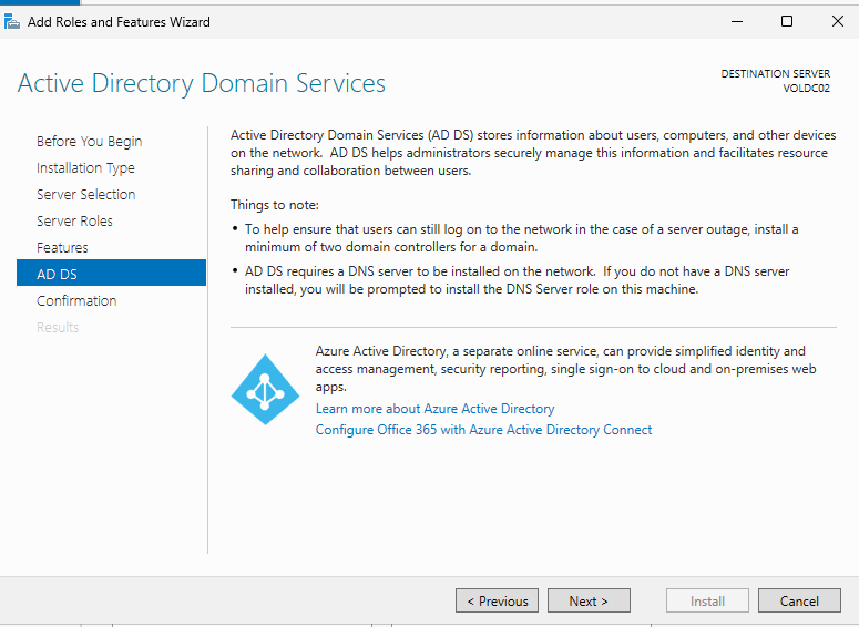 Yukarıdaki adımlar tamamlandıktan sonra Server Manager’dan – Add roles and fuatures dan active direcotry domain services rolü seçilir