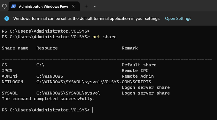 Net share komutu ile netlogon ve sysvol’ın share durumunda olduğu kontrol edilir.