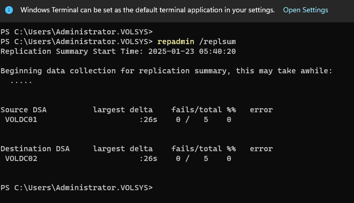 Repadmin /replsum komutu ile mevcut replikasyın durumu kontrol edilir.