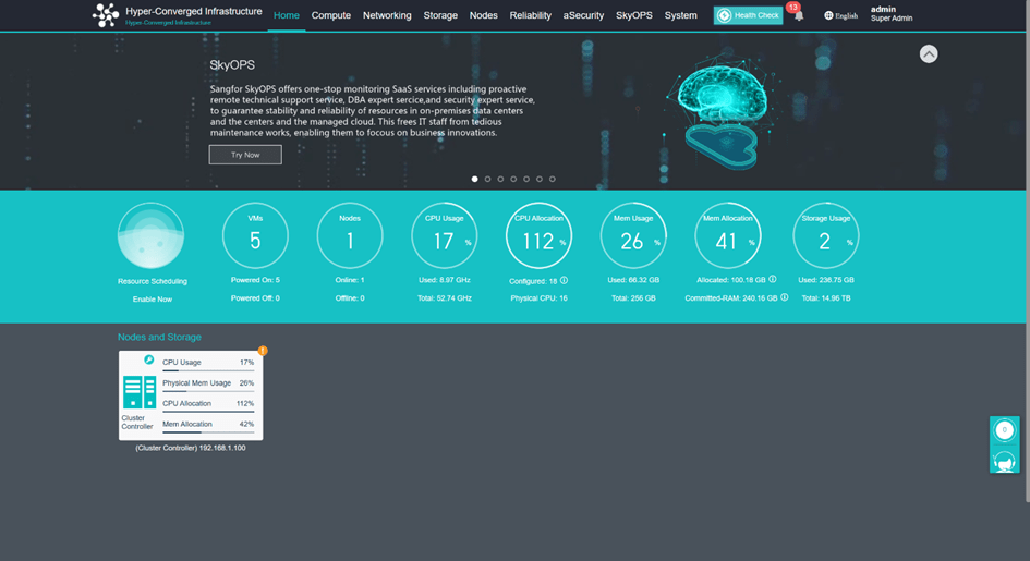 Sangfor HCI platformunun GUI’si (grafik kullanıcı arayüzü) aşağıda gösterilmiştir:
