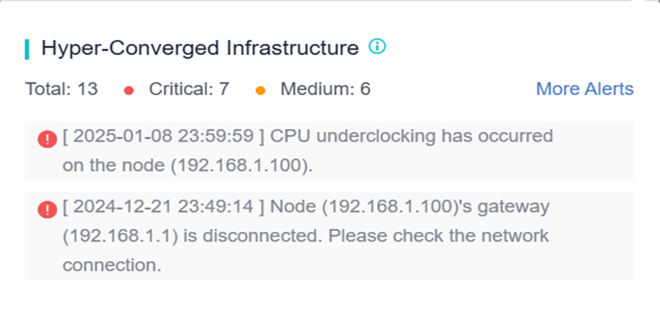 Ünlem işaretinin yanındaki sayı, alarm sayısını gösterir. SANGFOR HCI ve VMware vCenter (eğer eklenmişse) alarmlarının detaylarını görüntülemek için ünlem işaretine tıklayın.