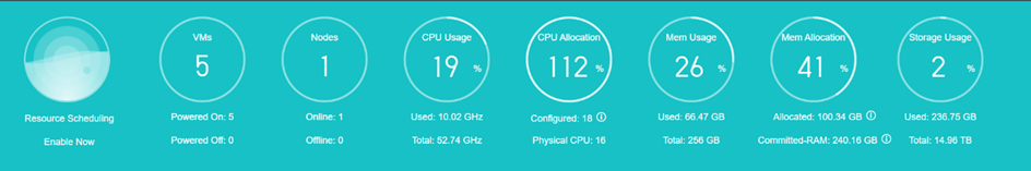 Bu bölüm, kaynak planlaması, düğümler, sanal makineler (VM’ler) ve depolama, CPU kullanımı, bellek kullanımı ve depolama kullanımı ile ilgili bilgileri görüntüler.