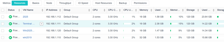Sanal makineler, Panel veya Liste olarak görüntülenebilir. Varsayılan olarak, sanal makineler Panel görünümünde görüntülenir. Liste görünümünde görüntülemek için Liste (List) seçeneğine tıklayın, aşağıda gösterildiği gibi: