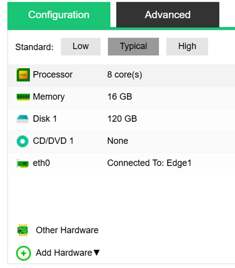 - Yapılandırma (Configuration): İşlemci, Bellek, Disk, CD/DVD ve NIC gibi donanım kaynaklarını yapılandırmanıza olanak tanır. Yapılandırma seçenekleri Düşük Yapılandırma (Low Configuration), Tipik Yapılandırma (Typical Configuration) ve Yüksek Yapılandırma (High Configuration) olarak ayrılır.