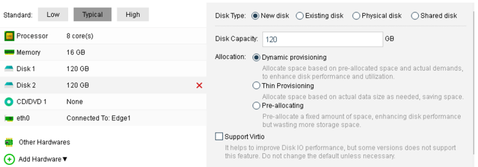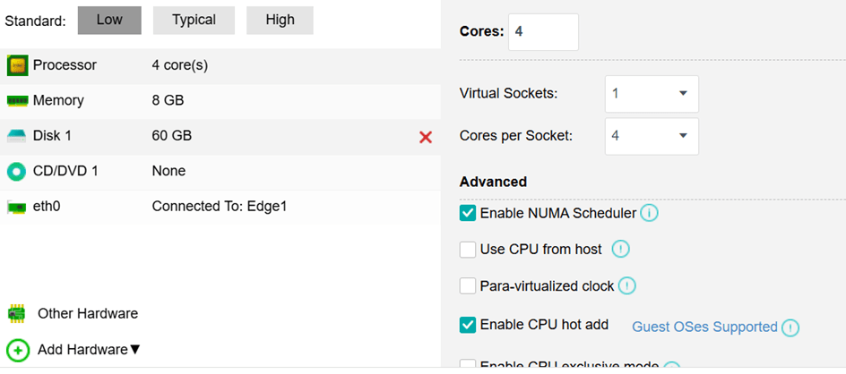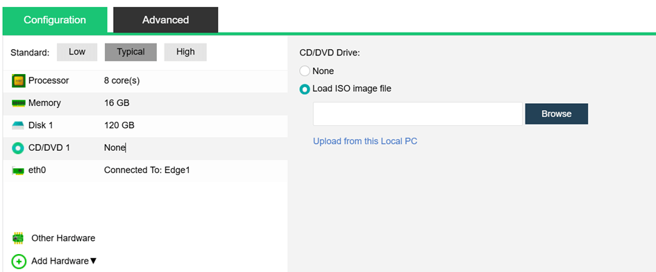 Varsayılan Düşük Yapılandırma (Default Low Configuration): 4 işlemci, 8 GB bellek, 60 GB disk, bir CD/DVD, bir NIC.