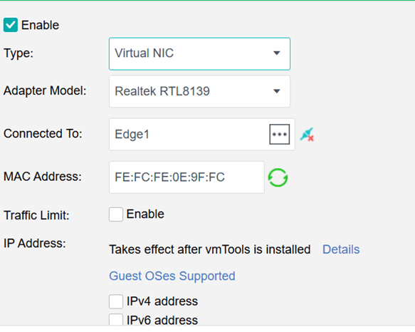 IPv4 ve IPv6 Adres Desteği (Support IPv4 and IPv6 address): Ağ kartına IPv4 ve IPv6 adresleri atanabilir. Ancak, yalnızca belirli Misafir İşletim Sistemlerini (Guest OS) destekler ve ayrıca VM araçlarının (VM Tools) kurulu olması gerekir.