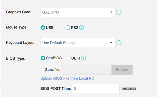 BIOS Seçeneği (BIOS Option): Seçenekler: SeaBIOS, UEFI BIOS ve Özel (Custom). Ayrıca BIOS POST Süresi (POST Time) de belirtilebilir.