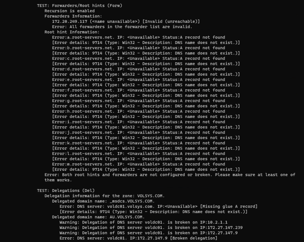 dcdiag /test:dns /v komutu, Active Directory Domain Controller (DC) üzerinde bulunan DNS yapılandırmasını test etmek için kullanılır.