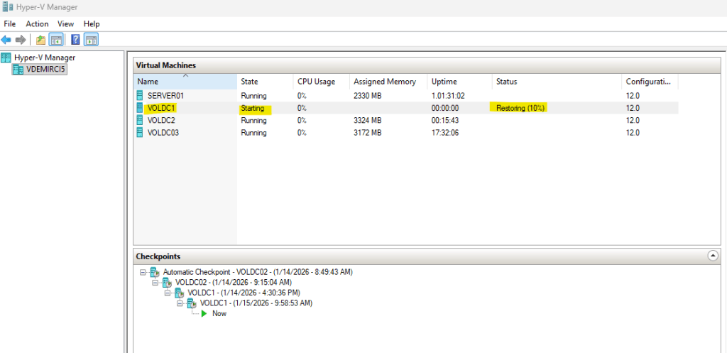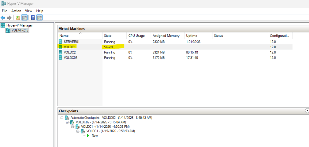FSMO Rolleri üzerinde tutan VOLDC01 herhangi bir sorun nedeniyle çalışamaz hale geliyor ( Bizim senaryomuzda shutdown ediliyor). Ardından FSMO Roller VOLDC02 üzerine seize ediliyor. Belirli bir süre sonra VOLDC01 VM platformunda olduğu için SNAPSHOT’tan revert ediliyor ve domain’deki etkisi inceleniyor.